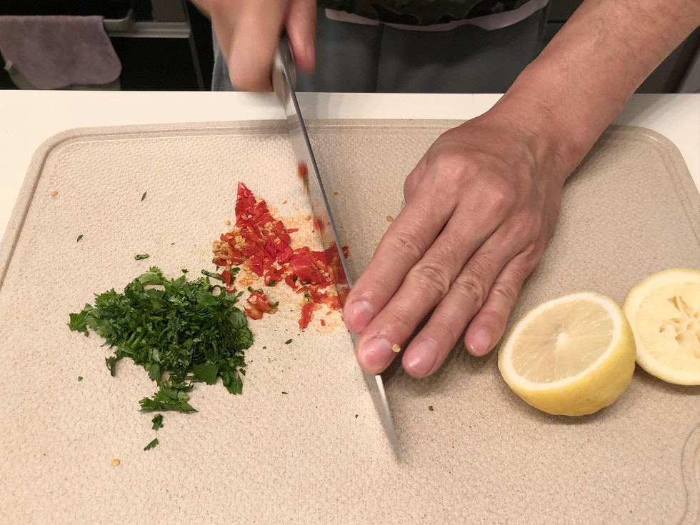 把切碎的芫荽及指天椒加進醬汁內攪勻
